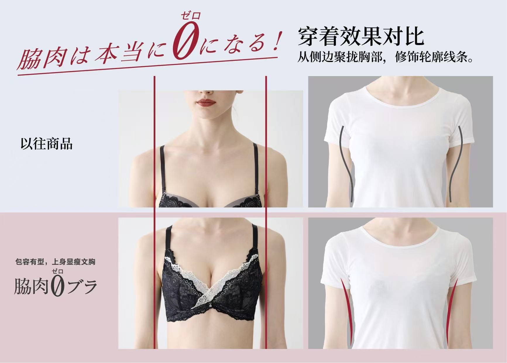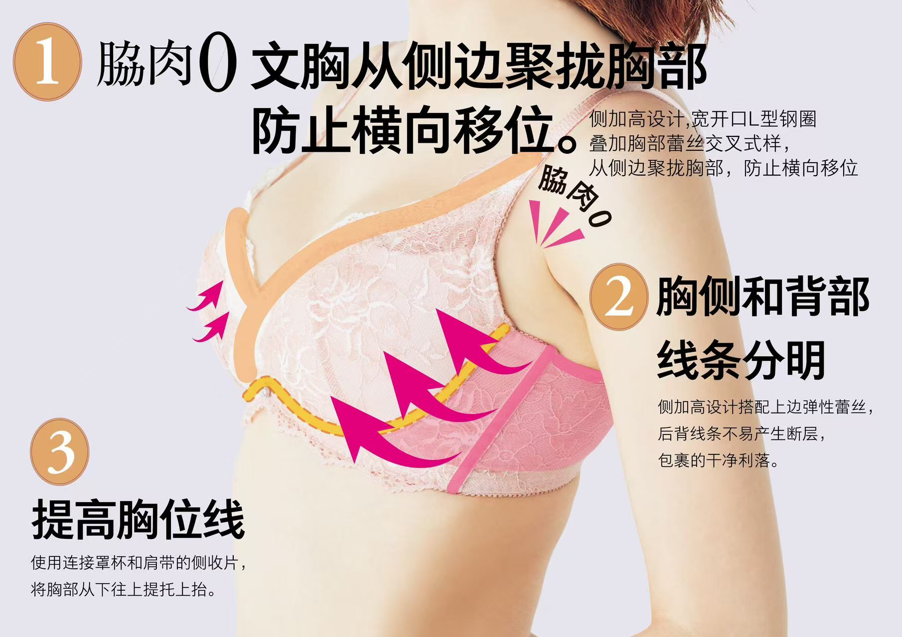 这款内衣能够有效收拢胸部两侧外溢的副乳,并将其集中塑形,打造利落流畅的侧线,轻松展现出凹凸有致的显瘦身形。针对约50%消费者在胸部困扰中关注的两大问题——「在意腋下和后背赘肉」以及「想穿出更好的身材线条」,品牌特别研发了这款内衣,旨在为更多消费者提供舒适的塑型显瘦穿着体验。